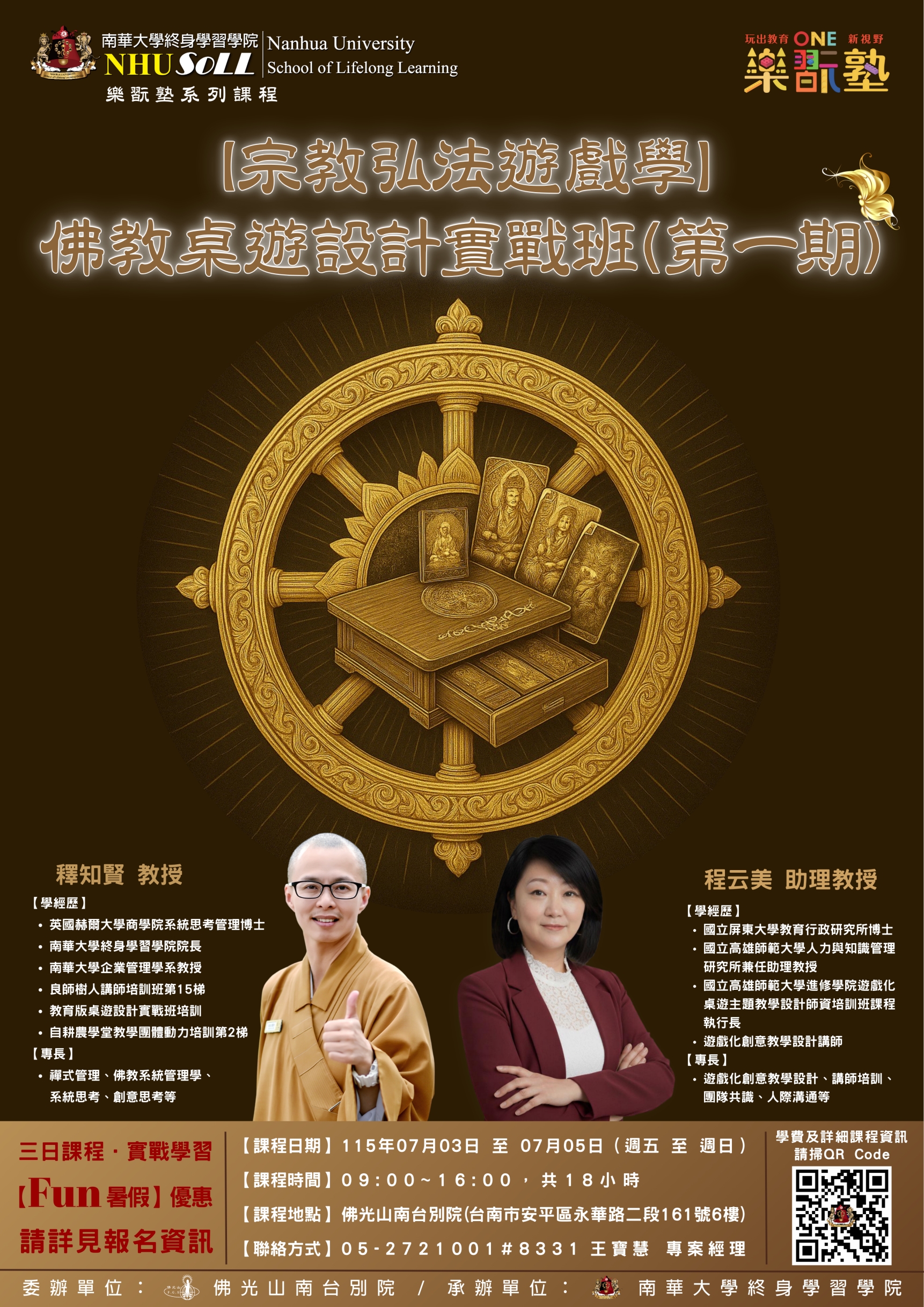 首頁南華大學學院簡介成員簡介最新消息媒體報導法規與 SOP下載專區 Prev Next |學分課程|研習課程|樂齡大學 |大型講座|職業委訓|課程需求單 我要找 【欲見‧觀自在】韓國三十三觀音巡禮朝聖研習營(第一期):三部 2026-01-09 心心禮觀音.步步觀自在旅遇佛國土.行見佛聖境.【欲見‧觀自在】韓國三十三觀音巡禮 更多資訊【創藝木頭人】(第四期):樹微型藝術盆景雕塑創作班 2025-12-04 【無需基礎】7小時學會雕塑「真柏」藝術品!【創藝木頭人】(第四期):樹微型藝術盆 更多資訊【宗教弘法遊戲學】佛教桌遊設計實戰班(第一期) 2025-06-11 【當智慧遇上遊戲,打造你的「佛系」桌遊!】您是否想過,深奧的佛法義理,也能化為一 更多資訊 最新消息 類別 標題公告日期 非學分班【創藝木頭人】(第四期):樹微型藝術盆景雕塑創作班2025-12-04非學分班【宗教弘法遊戲學】佛教桌遊設計實戰班(第一期)2025-04-01非學分班「企業勞動法務人員能力鑑定」考照輔導班(第一期)2025-06-25非學分班【Line官方帳號行銷培訓班】第08期 2025-10-23非學分班【人間生命管理學】覓「識」逃脫三部曲(第二期)2025-10-15非學分班【欲見‧觀自在】韓國三十三觀音巡禮朝聖研習營(第一期):二部2025-06-13其他1143雲林斗六社會工作師學士學分班2026-01-09其他1143雲林虎尾社會工作師學士學分班2026-01-08其他1143嘉義市嘉義會館社會工作師學士學分班2026-01-02其他1142學分班(隨班選讀)簡章-報名表2025-11-06 更多消息 熱門課程 類別標題開課單位 非學分班【欲見‧觀自在】韓國三十三觀音巡禮朝聖研習營(第一期):三部上課日期:2026-08-01~2026-08-08南華大學 終身學習學院非學分班【創藝木頭人】(第四期):樹微型藝術盆景雕塑創作班上課日期:2026-02-01~2026-02-01南華大學 終身學習學院非學分班【Line官方帳號行銷培訓班】第08期 上課日期:2025-11-22~2025-12-13南華大學 終身學習學院非學分班【人間生命管理學】覓「識」逃脫三部曲(第二期)上課日期:2025-12-27~2025-12-28南華大學 終身學習學院非學分班「企業勞動法務人員能力鑑定」考照輔導班(第一期)上課日期:2025-10-19~2025-11-14南華大學 終身學習學院非學分班【欲見‧觀自在】韓國三十三觀音巡禮朝聖研習營(第一期):二部上課日期:2025-10-25~2025-11-01南華大學 終身學習學院非學分班【宗教弘法遊戲學】佛教桌遊設計實戰班(第一期)上課日期:2026-07-03~2026-07-05南華大學 終身學習學院非學分班寵物長照之犬貓營養膳食與漢方膳食實作班第02期上課日期:2025-05-10~2025-07-05南華大學 終身學習學院