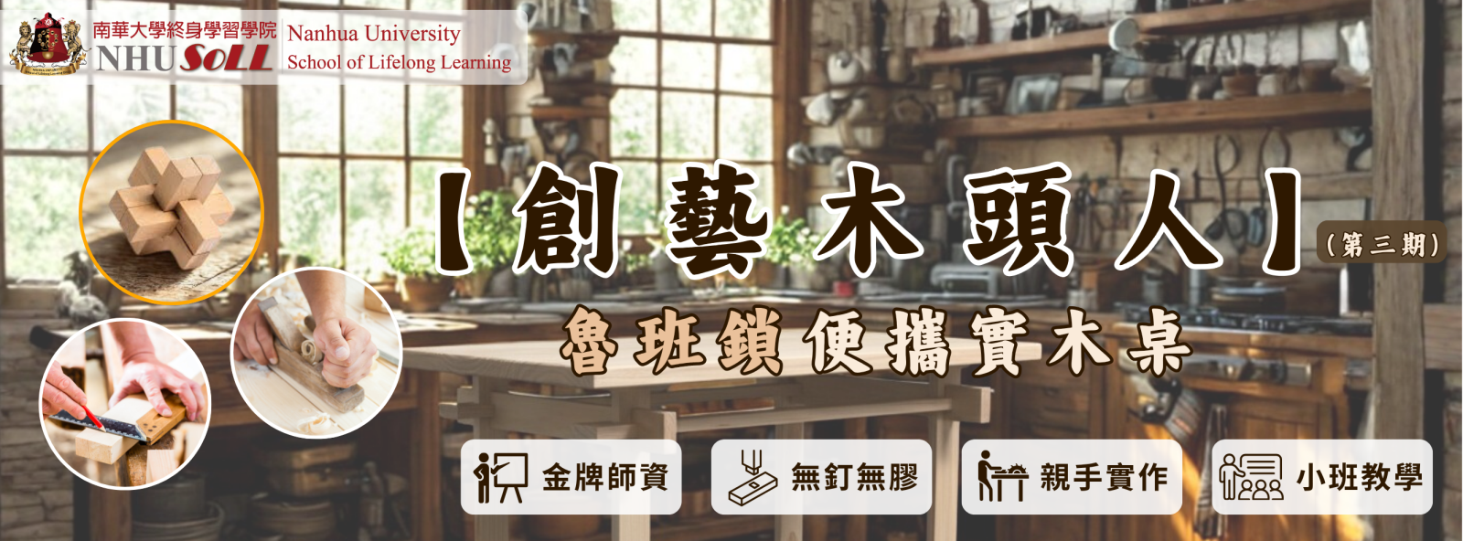 首頁南華大學學院簡介成員簡介最新消息媒體報導法規與 SOP下載專區 Prev Next |學分課程|研習課程|樂齡大學 |大型講座|職業委訓|課程需求單 我要找 課程名稱:【創藝木頭人】(第三期):魯班鎖便攜實木桌 授課教師: 上課日期:2025-11-29~2025-12-06上課時間:09:00~16:00上課星期節次:星期6第2節、星期6第3節、星期6第4節、星期6第6節、星期6第7節、星期6第8節、星期日第2節、星期日第3節、星期日第4節、星期日第6節、星期日第7節、星期日第8節、 上課地點:校本部設計造型工坊 課程費用: 課程說明如下 您是否曾嚮往親手打造一件實用又富含文化底蘊的家具? 【創藝木頭人(第三期):魯班鎖便攜實木桌】 無釘無膠巧思,千年匠心一桌 . 這不只是一堂 #木工課, 更是一場探索「#傳統工藝」與「#現代設計」的深度之旅。 我們將從 #魯班鎖(#孔明鎖)的歷史與結構原理講起, 在全國金牌講師 #吳芫樟 老師的指導下, 即使是新手,也能完成令人驚豔的作品。 . ❙ 課程將學到 ❙ #安全講解與材料介紹: 學習安全操作機具,並認識木材。 #榫卯結構實作: 親手製作傳統木作的靈魂。 #鉋削與細緻打磨: 將木料表面處理至平滑細緻。 #塗裝與上蠟保護: 為作品穿上美麗的防護層。 #教學核心: 全程以您的親手實作為主,確保完整學習。 . 15人 #小班教學,給自己三天時間, 創造一件能陪伴你很久的禮物。 . ▏#課程資訊 ▏ 【課程日期】114年11月29日(六)、11月30日(日)、12月06日(六) 【課程時間】09:00 - 16:00 (共18小時) 【課程地點】南華大學校本部設計造型工坊 (嘉義縣大林鎮南華路一段55號) 【年終優惠價】NT$7,999元/期(含材料費&教具使用費、個人保險) (課程原訂價$ 9,800元) 【立即報名】https://lihi3.me/ihWkh/SoLL 【聯絡電話】05-2721001分機8332 王寶慧專案經理