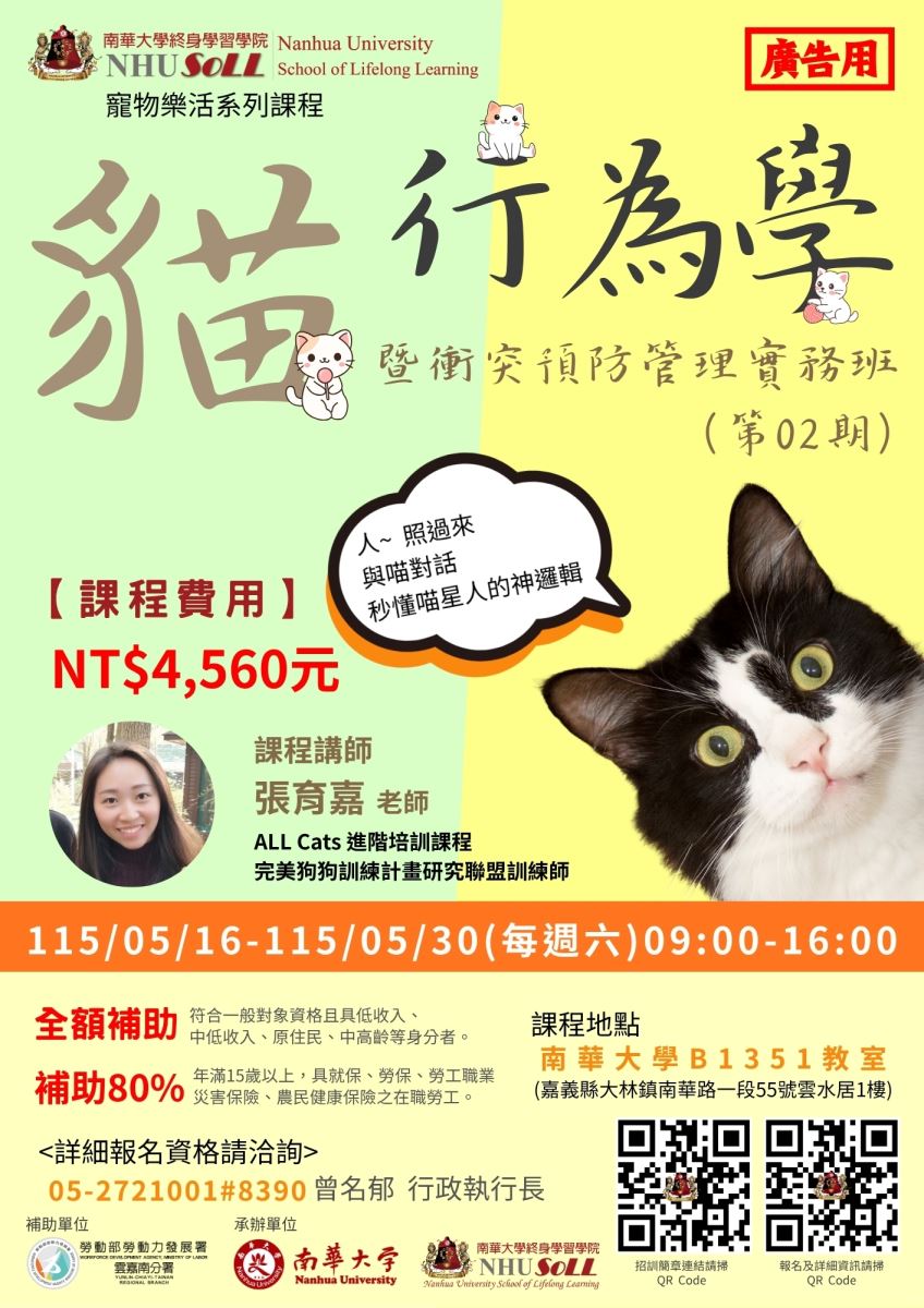 首頁南華大學學院簡介成員簡介最新消息媒體報導法規與 SOP下載專區 Prev Next |學分課程|研習課程|樂齡大學 |大型講座|職業委訓|課程需求單 我要找 課程名稱:【貓行為學暨衝突預防管理實務班】(第02期) 授課教師: 上課日期:2026-05-16~2026-05-30上課時間:09:00~16:00上課星期節次:星期6第2節、星期6第3節、星期6第4節、星期6第5節、星期6第6節、星期6第7節、 上課地點:南部南華大學B1351教室 (嘉義縣大林鎮南華路1段55號雲水居) 課程費用: 課程說明如下 【三週蛻變!成為人氣吸貓體質】 您是否也期待,與喵主子的每一天都充滿陽光與呼嚕聲? 南華大學終身學習學院超熱門 「喵喵行為學班」第 02 期 明天(4/15)中午12點報名開跑啦! 從懂貓到寵貓,換取喵主子撒嬌的甜蜜日常, 跟著專業引導,開啟您與喵主子的幸福新篇章: #營造多貓和諧天堂 透過聰明環境規劃,讓毛孩學會彼此陪伴,把家變成溫暖避風港。 #成為貓咪的知心好友 精準解讀肢體語言,在「親親撒嬌」與「享受獨處」間建立完美默契。 #掌握輕鬆相處的竅門 深入了解愛貓需求,讓日常照護優雅又充滿樂趣,生活更自在! 本期課程核心價值: 避開貓咪討厭的雷點 掌握多貓家庭和平秘訣 讓貓咪在低壓環境下快樂長大 立即點擊報名,預約您的幸福喵生活: #課程資訊 【上課日期】115/05/16 ~ 115/05/30 (每週六) 09:00~16:00 【上課地點】南華大學B1351教室 (嘉義縣大林鎮南華路1段55號雲水居) 【課程費用】NT4,560元 【課程資訊】https://ojt.wda.gov.tw/ClassSearch/Detail?OCID=168869...... 全額補助:年滿45歲且具勞保、農保、漁保身份者 補助80%:年滿15歲具就保、勞保、勞工職業災害保險、農保、漁保身份者 <需先繳交全額課程費用,符合補助及結業規定,結訓後由勞動部核撥補助款> 【聯絡電話】05-2721001分機8390 曾名郁 行政執行長 #南華大學終身學習學院 #貓咪行為學 #吸貓體質 #多貓家庭 #新手毛孩爸媽必修課程 #貓星人