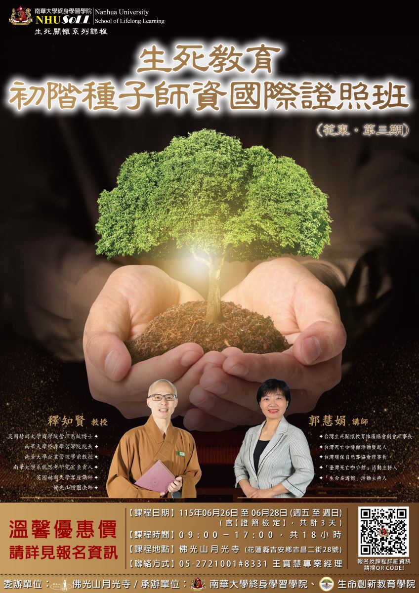 首頁南華大學學院簡介成員簡介最新消息媒體報導法規與 SOP下載專區 Prev Next |學分課程|研習課程|樂齡大學 |大型講座|職業委訓|課程需求單 我要找 課程名稱:【生死教育初階種子師資國際證照班】(花東.第三期) 授課教師: 上課日期:2026-06-26~2026-06-28上課時間:09:00~17:00上課星期節次:星期5第2節、星期5第3節、星期5第4節、星期5第5節、星期5第6節、星期5第7節、星期5第8節、星期5第9節、星期6第2節、星期6第3節、星期6第4節、星期6第5節、星期6第6節、星期6第7節、星期6第8節、星期6第9節、星期日第2節、星期日第3節、星期日第4節、星期日第5節、星期日第6節、星期日第7節、星期日第8節、星期日第9節、 上課地點:東部佛光山月光寺(花蓮縣吉安鄉吉昌二街28號) 課程費用: 課程說明如下 【掌握生命解碼器 成為生死自在的專業領航者!】 面對生命的終點,我們需要的不是恐懼,而是智慧。 . 從「#被迫面對」到「#坦然應對」 去年花蓮經歷了馬太鞍溪災情的衝擊,大自然的力量讓我們看見生命的脆弱,也讓生死議題從「#閉口不談」變成了「#必須面對」。 當變故來襲,我們能扮演什麼樣的角色? 是手足無措的旁觀者,還是溫暖堅定的指引者? 這不只是一張證照,更是一份傳遞生命尊嚴的使命。 . #雙大師親自授課 由 #死亡咖啡館發起人 #郭慧娟老師 與 #釋知賢教授 聯手指導, 帶您深入淺出 #掌握生死知識,將這份正能量帶入社區、校園與家庭,讓愛與尊嚴在每個角落紮根。 - #課程資訊 【生死教育初階種子師資國際證照班】 (花東.第三期) 【課程日期】115年06月26日至06月28日(週五至週日) 【課程時間】09:00 - 17:00,共18小時 【課程地點】佛光山月光寺(花蓮縣吉安鄉吉昌二街28號) 【溫馨優惠價】詳如課程資訊 【課程資訊】https://lihi3.me/8JfMR/SoLL 【聯絡電話】05-2721001#8331 王寶慧 專案經理